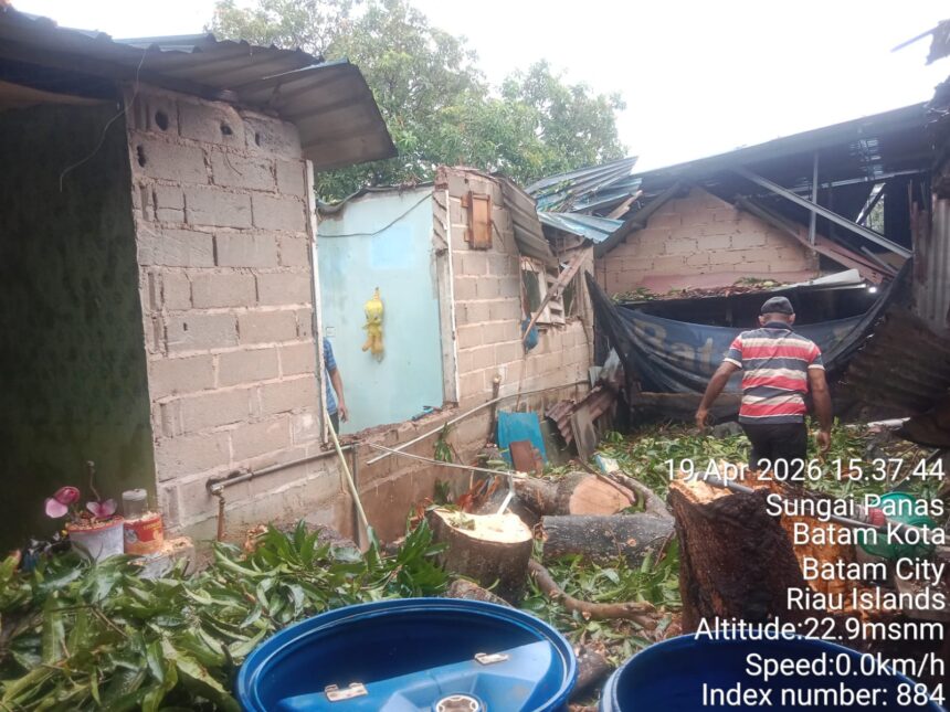 SATU unit rumah rusak berat akibat tertimpa pohon mangga berukuran besar yang tumbang saat hujan deras disertai angin kencang, yang terjadi pada Minggu (19/04/2026) pagi di Kampung Harapan Swadaya RT 01/RW 05, blok AG3 NO 1, Kelurahan Sadai, Bengkong.
