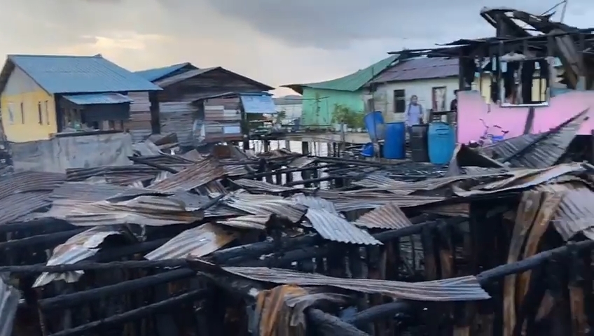 KEBAKARAN melanda rumah-rumah warga di Pulau Buluh, Kota Batam, Jumat (21/1/2022). Kemarin. Hingga sabtu (221/2022( tercatat ada 19 rumah yang terbakar dengan jumlah warga terdampak mencapai 75 orang.