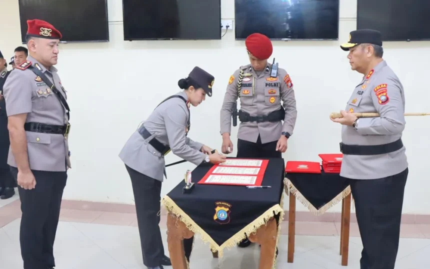 Upacara Sertijab ditandai dengan penandatanganan berita acara serah terima jabatan, pengambilan sumpah jabatan, serta penyerahan memori jabatan, yang disaksikan oleh Pejabat Utama Polda Kepri, para Kapolres jajaran, perwira, serta undangan terkait.