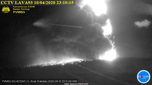 Erupsi Gunung Anak Krakatau terekam dua kali pada Jumat malam. Pada erupsi yang pertama, tinggi kolom abu mencapai 200 meter.