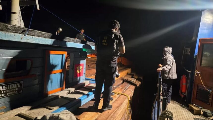 PETUGAS Bea Cukai Batam melalui tim patroli lautnya mengamankan KM Rasidin, sebuah kapal yang membawa muatan kayu balok tanpa dokumen resmi di perairan Pulau Hangop, Rabu dini hari (3/12/2025).