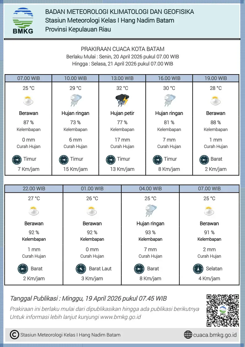 BADAN Meteorologi Klimatologi dan Geofisika (BMKG) melalui Stasiun Meteorologi Kelas I Hang Nadim memprakirakan cuaca di Batam pada Senin, 20 April 2026 hingga Selasa, 21 April 2026 didominasi kondisi berawan dengan potensi hujan ringan hingga hujan petir pada siang hari.