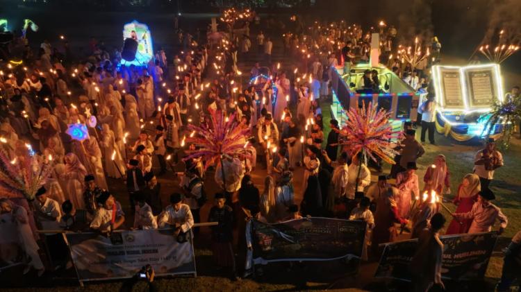 Ribuan masyarakat tumpah ruah, memadati jalur menuju Bundaran. Mereka datang untuk menyaksikan kemeriahan yang berbeda tahun ini. Ratusan obor yang menyala menjadi penerang, mengiringi setiap kalimat Allahu Akbar yang dilantunkan.