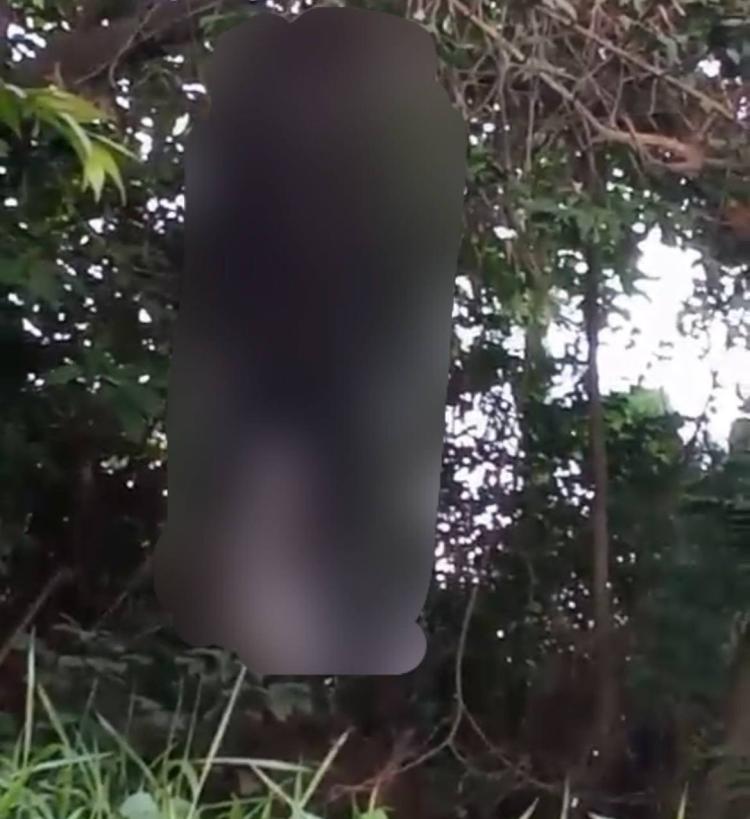 Mayat yang diduga kuat berjenis kelamin laki-laki tersebut tergantung dengan laher tergantung di sebuah pohon di tebing pinggir jalan Yos Sudarso.