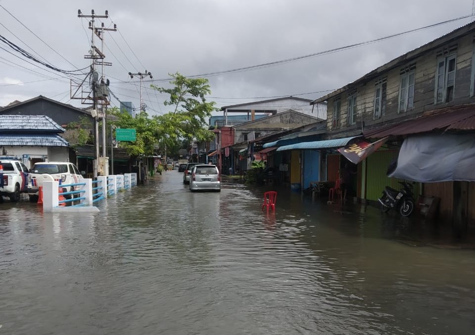 BANJIR yang diakibatkan pasang air laut (rob) melanda dua kawasan di Kecamatan Bintan Utara, Bintan, Jumat (1/1).