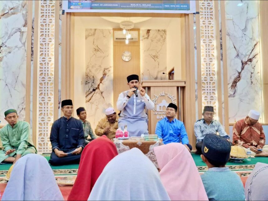 RATUSAN jamaah hadir dalam peringatan Isra Mi’raj Nabi Muhammad SAW yang digelar di masjid Al-Ishlaah RW 20 Perumahan Cipta Permata, Kelurahan Sadai, Jum’at (23/01/2026) malam.