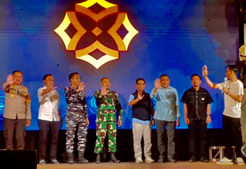 Bupati Karimun, Iskandarsyah, bersama Forkopimda Kabupaten Karimun saat meluncurkan logo branding daerah dengan tema besar, “Melaju dalam Harmoni”, di Panggung Putri Kemuning Coastal Area, Tanjungbalai Karimun. F/ Disediakan Gowest.id
