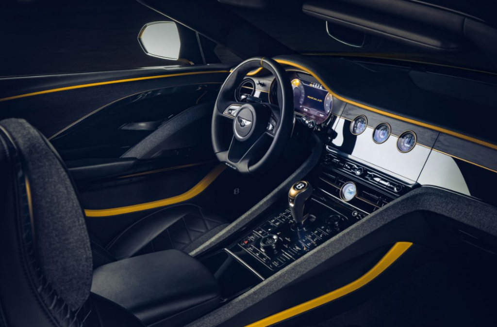 Untuk kabin, pengrajin Mulliner menciptakan kokpit khusus, menampilkan desain sampul yang mengalir dari konsol tenah miring ke dasbor, sebelum menyapu ke panel pintu.