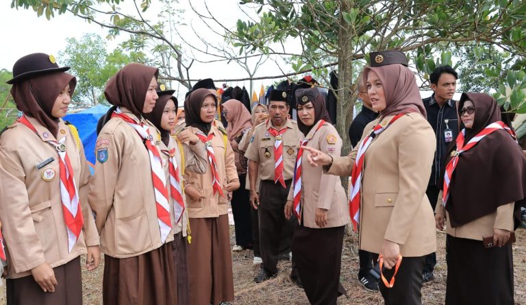 Wakil Bupati Bintan, Deby Maryanti saat berdialog dengan Pramuka setelah membuka kegiatan di Bumi Perkemahan Tembeling, Kecamatan Teluk Bintan, Kamis (14/8/2025). F. Ist. Disediakan oleh GoWest. ID