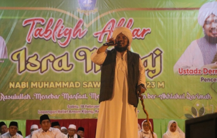 DAI kondang, Ustad Derry Sulaiman, mengisi tausiah pada peringatan Isra Miraj 1444 Hijriah/2023 Masehi di Kabupaten Binta di Lapangan Relief Antam Kijang, Sabtu malam (18/2/2023) lalu.