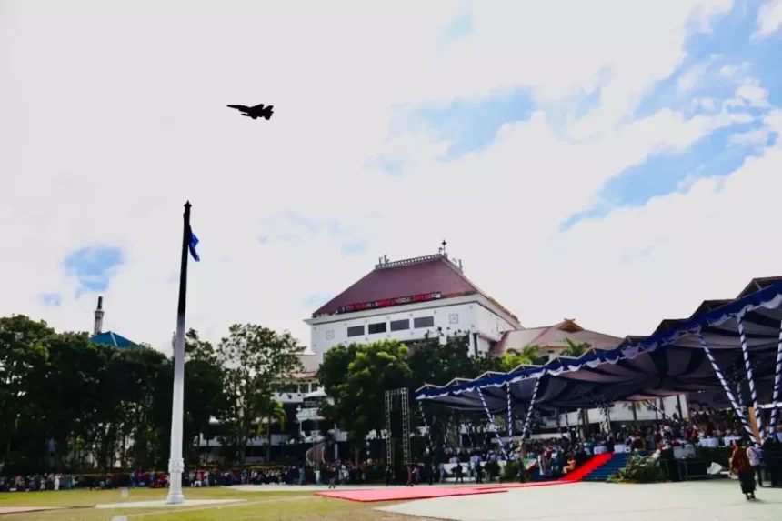 DUA pesawat tempur F-16 Fighting Falcon TNI AU menjadi bintang utama di acara Batam Solidarity Airshow 2025, yang digelar dalam rangka Hari Jadi Batam ke-196 di Dataran Engku Putri, Kamis (18/12/2025).