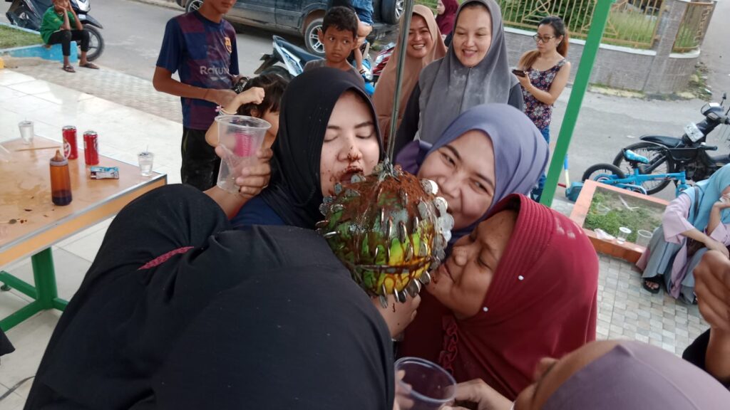 Tak kalah menariknya, saat lomba mengambil koin dari buat semangka. Semangka yang sudah dilumuri kecap dan bubuk kopi tersebut, menjadi tantangan tersendiri bagi peserta.