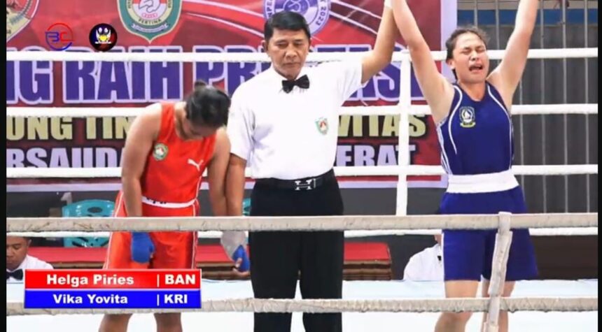 Kepastian tiket PON XXI yang diraih Vika Lido Yovita, usai dirinya bertarung dengan petinju asal Banten, Helga Viries, di GOR Flobamora Oepoi, Kupang NTT.
