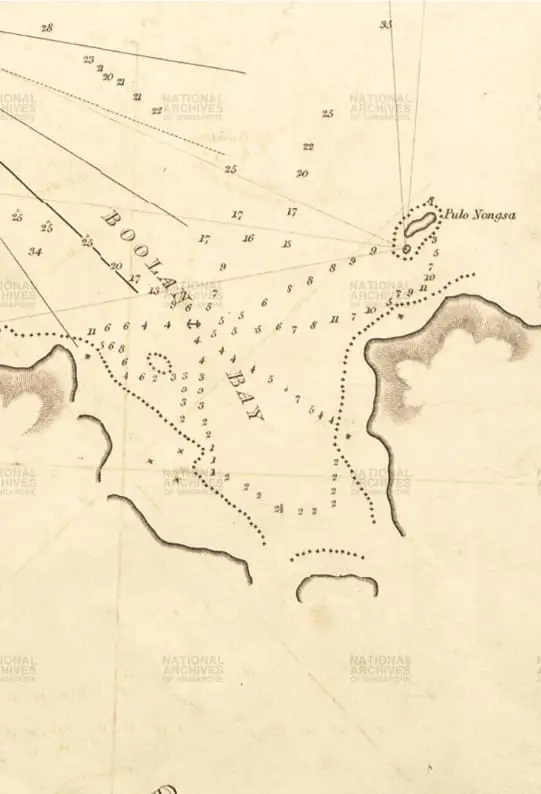 “Teluk Boolang, di Pulo Battam,, terletak kira-kira 13 atau 14 miles sebelah tenggara Singapura, menyediakan tempat berlabuh yang aman, dan akhir-akhir ini sering dikunjungi kapal-kapal Amerika; di sini mereka memperoleh barang muatan, dan berdagang dengan Singapura, dalam rangka menghindari biaya tambahan bila langsung pergi ke Singapura, karena Teluk boolang berada di luar batas wilayah kekuasaan Inggris”.