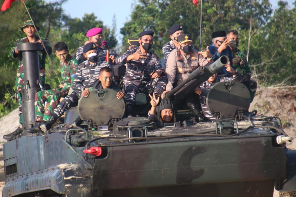 WAKAPOLDA Kepri, Brigjen Pol Drs. Darmawan, M. Hum bersama Kepala Staf Angkatan Laut Laksamana TNI, Yudo Margono, SE, MM meninjau langsung Latihan Pertempuran Operasi pendaratan tingkat Koarmada I dan Peresmian Puslatpurmar 9 Dabo Singkep, Kabupaten Lingga, Sabtu (10/4).